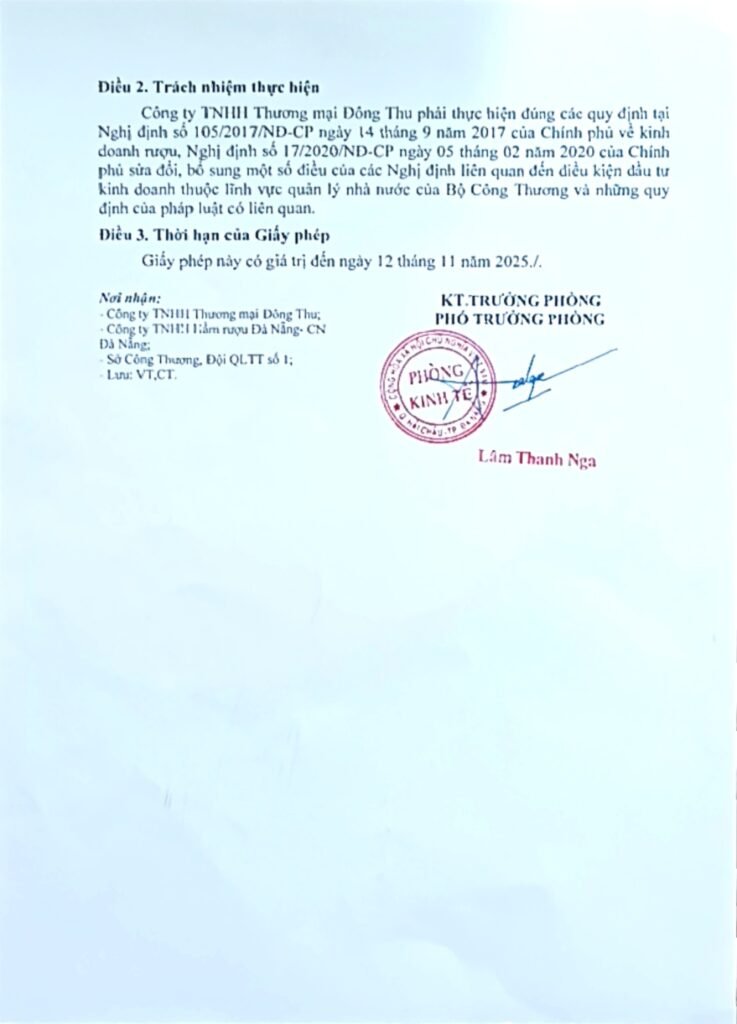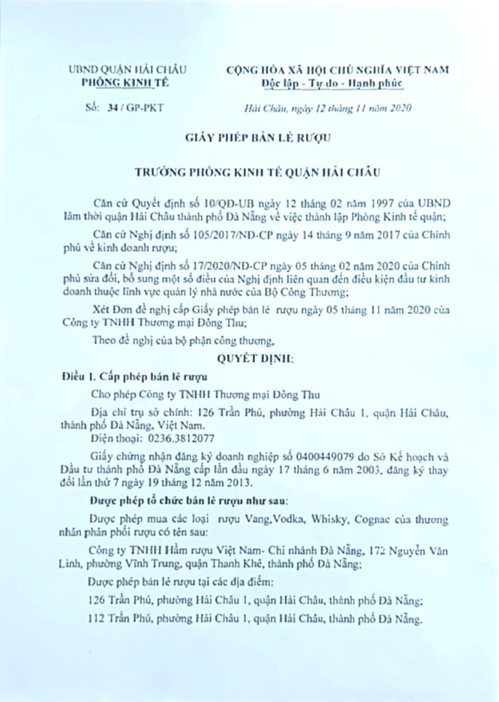 *GIẤY PHÉP BÁN LẺ RƯỢU SỐ 34/GP-PKT DO ĐƠN VỊ TRƯỞNG PHÒNG KINH TẾ QUẬN HẢI CHÂU CẤP NGÀY 12 THÁNG 11 NĂM 2020
